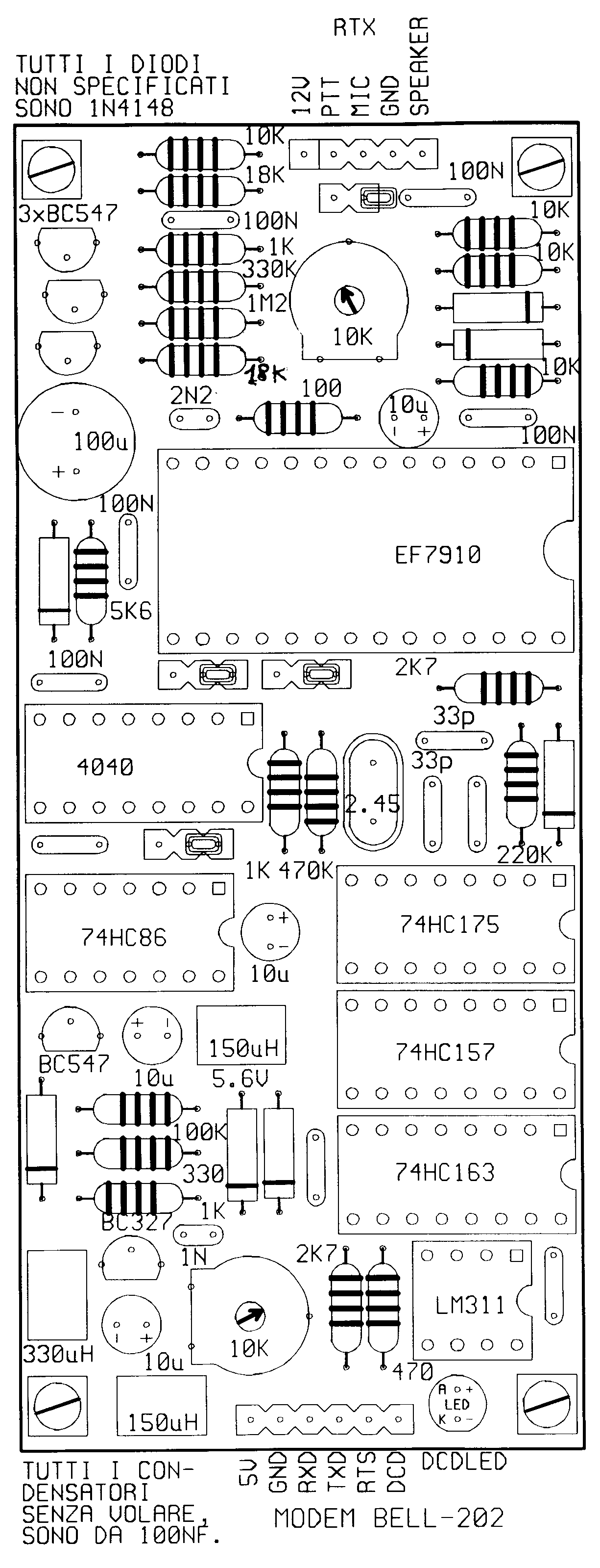 Il modem Bell e' molto semplice da realizzare ed utilizza il classico integrato AM7910 o EF7910 ed alcuni componenti CMOS della serie 74HCxx reperibili nei negozi specializzati.