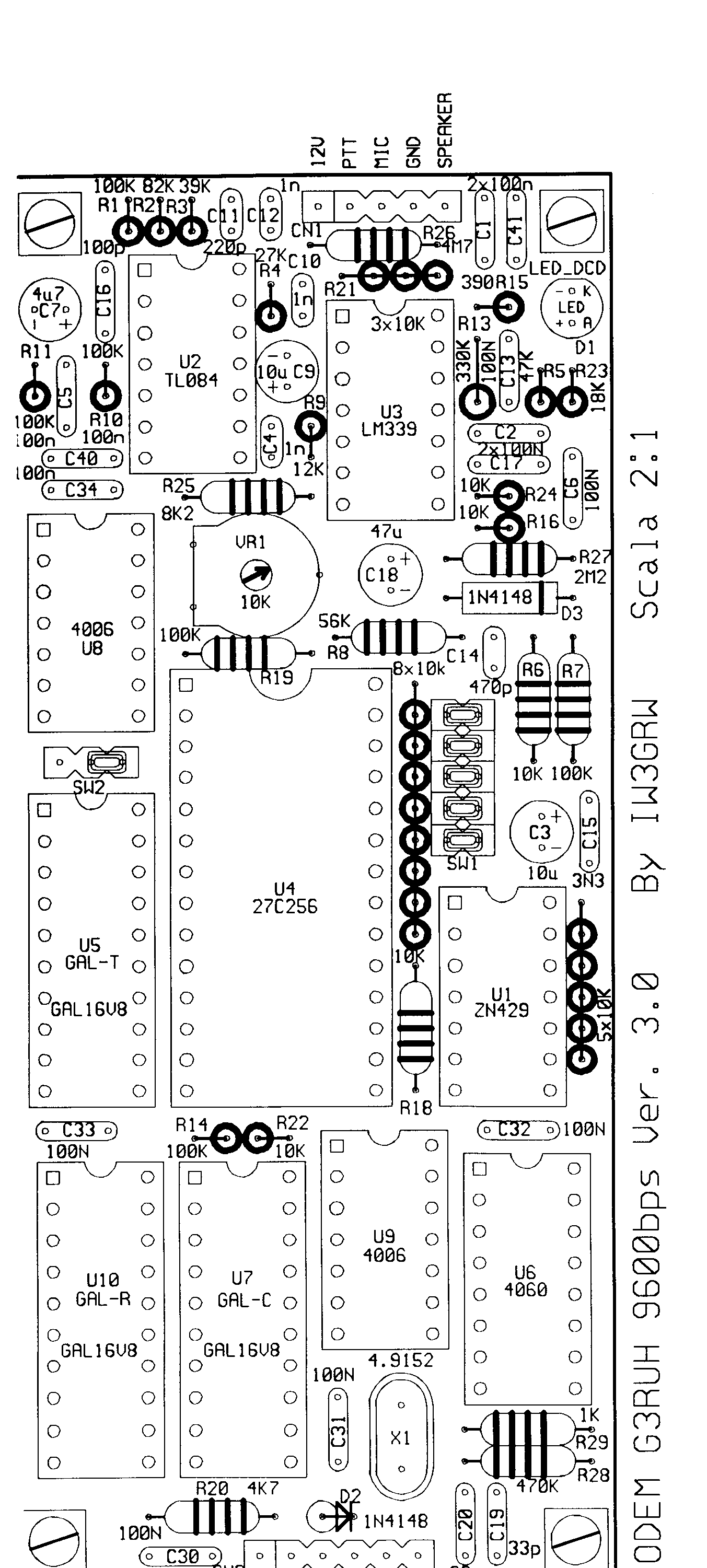 Ci sono inoltre due trimmer ( R4 e R15 ) da regolare. R4 regola il livello di modulazione e generalmente va regolato affinche la stazione con la quale siamo collegati riceva tutti i pacchetti che vengono da noi trasmessi, mentre R15 regola la sensibilita' del DCD digitale.