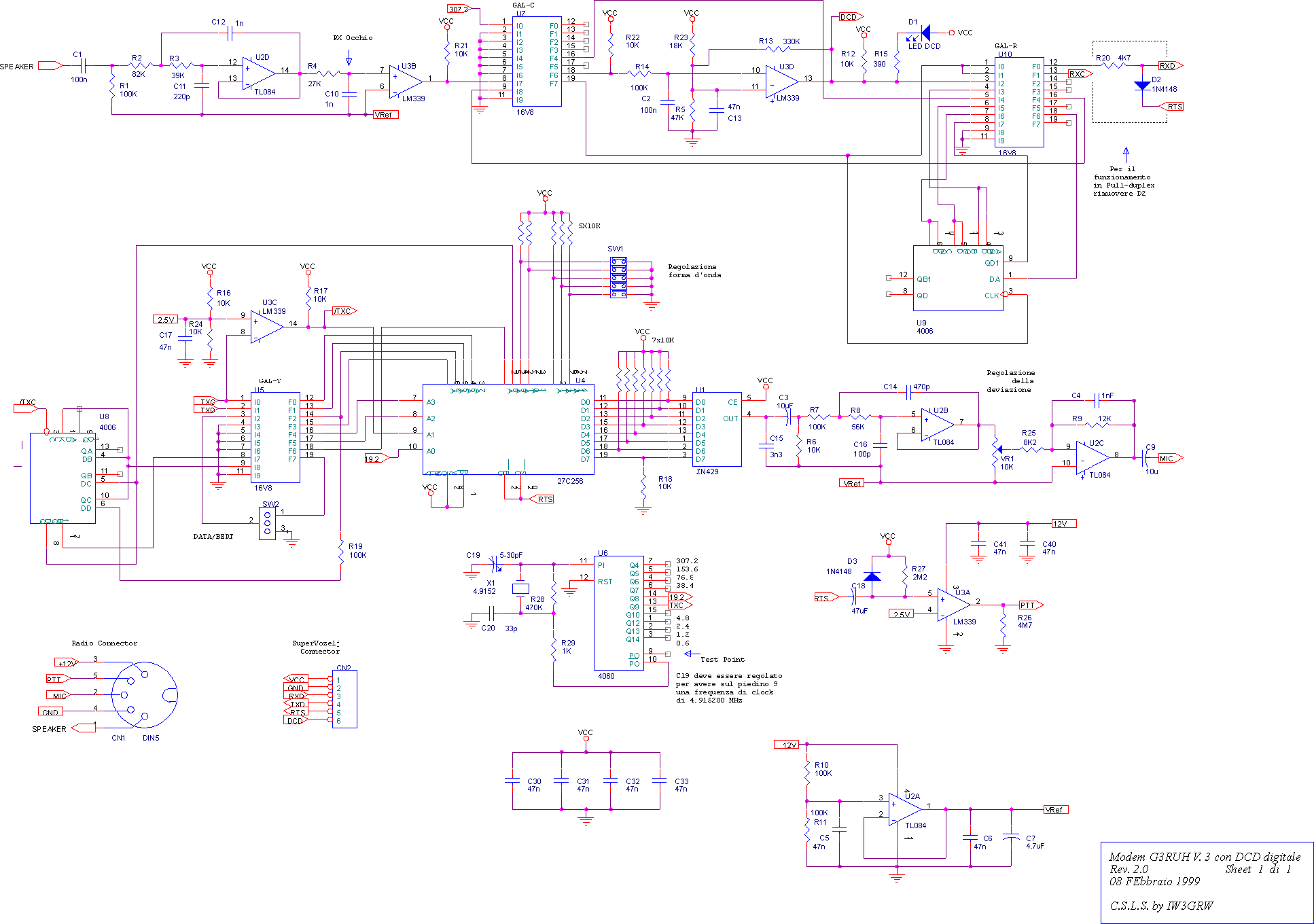 Inoltre, come nella versione precedente, e` stato implementato il generatore di clock e il circuito di PTT/watchdog che invece non sono presenti nel modem originale di G3RUH; in questo modo risulta notevolmente semplificato il collegamento del modem ai TNC, ma soprattutto risulta possibile il collegamento ai nodi multicanale come SuperVozelj e alle schede SCC senza l'aggiunta di circuiteria esterna.