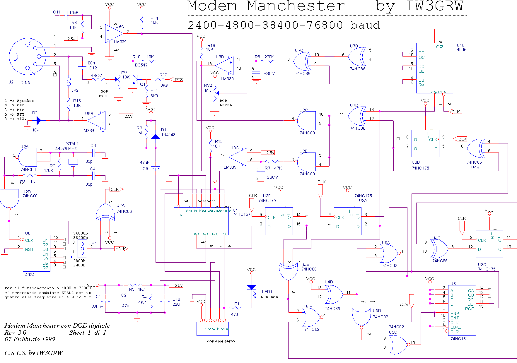 Il modem Manchester e' molto semplice da realizzare e il tipo di modulazione e' facilmente decodificabile perche' meno critica alle distorsioni, riflessioni, percentuale di modulazione ecc., a differenza di altri tipi di modem (G3RUH); il montaggio dello stampato non e' difficile e presenta tutti componenti CMOS della serie 74HCxx reperibili in negozi specializzati.